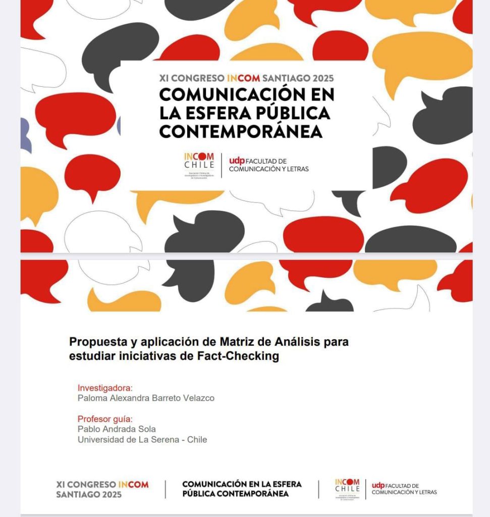 Durante el evento, organizado por la Universidad Diego Portales y la Asociación Chilena de Investigadores en Comunicación (INCOM Chile), la investigadora presentó la ponencia “Propuesta y aplicación de Matriz de Análisis para estudiar iniciativas de Fact-Checking”, desarrollada en colaboración con el profesor Pablo Andrada Sola, de la Universidad de La Serena (Chile).