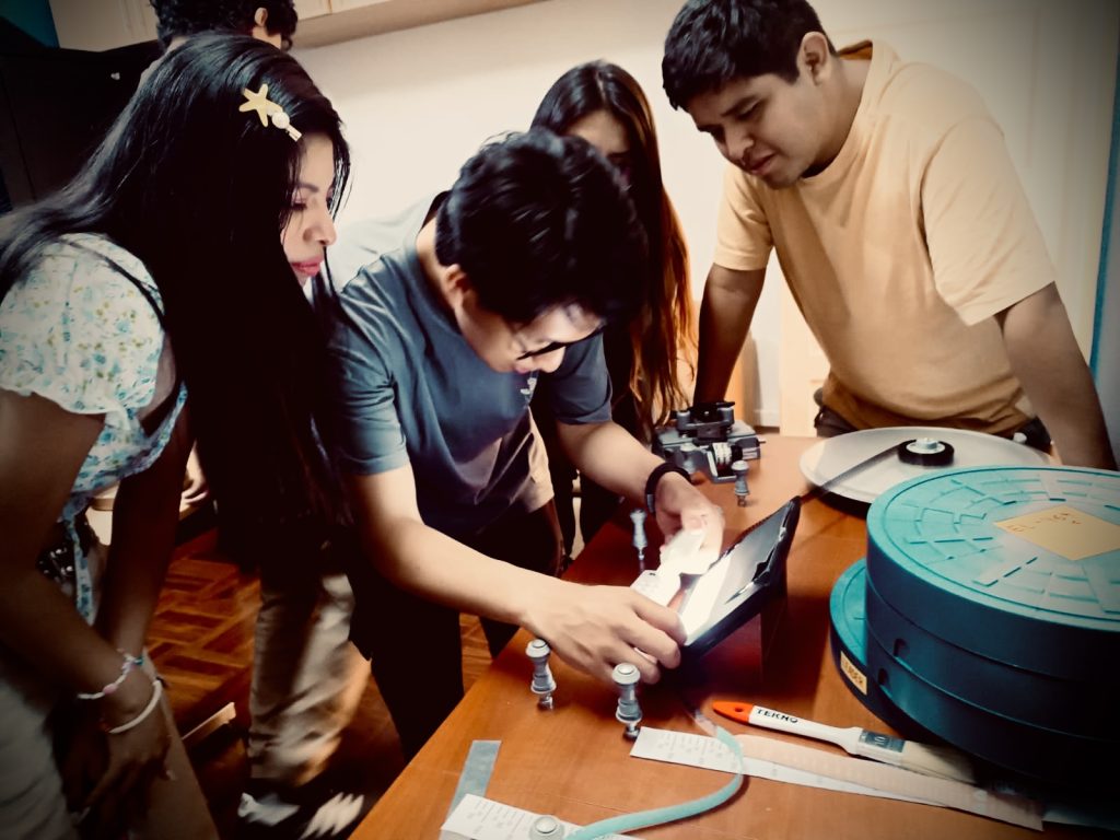 La visita continuó en el área de restauración, donde los alumnos observaron el funcionamiento del escáner Cintel, utilizado para digitalizar las películas que se encuentran en formato fílmico. Este equipo ha sido clave en la restauración de obras emblemáticas del cine peruano, como Gregorio (1984) y Juliana (1989), ambas dirigidas por el Grupo Chaski y recientemente restauradas por Guarango para su reestreno en el Festival de Cine de Lima.