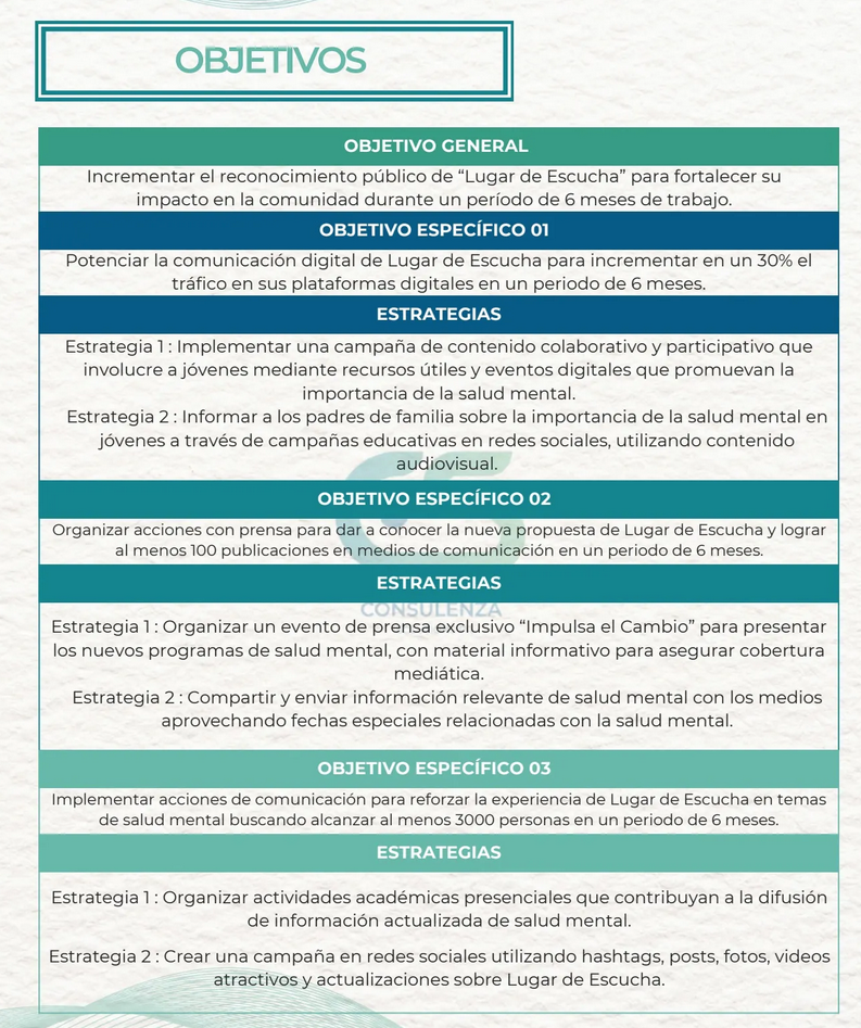 La ONG CEDRO, comprometida con el bienestar de los jóvenes en Perú, ha identificado la necesidad de relanzar su programa "Lugar de Escucha". Este programa tiene como objetivo principal brindar apoyo psicoemocional a jóvenes y sus familias, ofreciendo un espacio seguro para tratar temas sensibles como la salud mental, la prevención de adicciones y el desarrollo emocional. En un contexto donde la salud mental juvenil ha cobrado mayor importancia debido a la pandemia y otros factores sociales, el relanzamiento busca adaptar el programa a las nuevas necesidades de su público objetivo y mejorar su alcance.