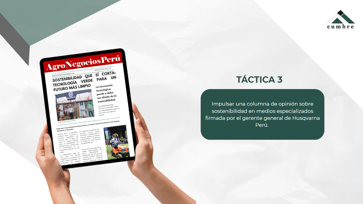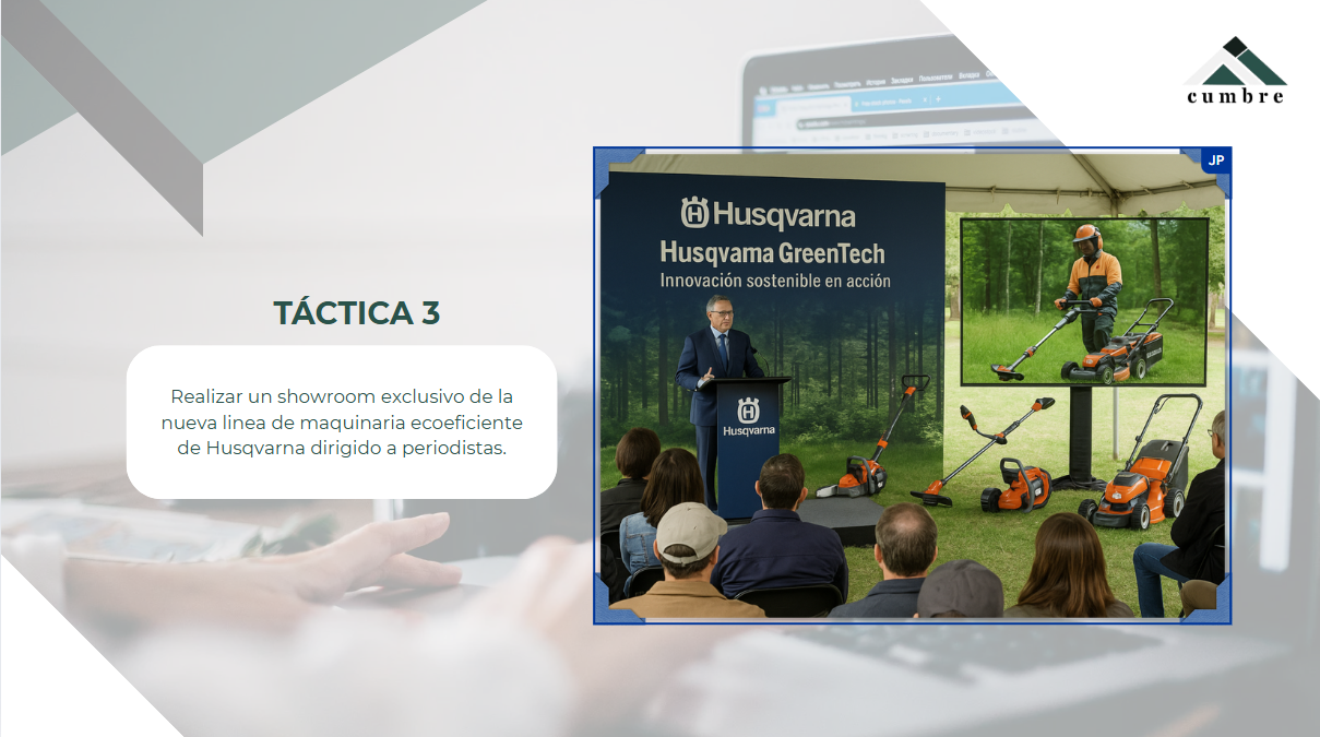 El plan contempla actividades como la organización de eventos especializados, generación de contenido técnico para públicos estratégicos, vinculación con medios de comunicación, y presencia en espacios académicos y técnicos, con el propósito de reforzar el liderazgo de Husqvarna en el uso de maquinaria ecoeficiente. Este enfoque busca no solo aumentar el reconocimiento de la marca, sino también construir vínculos sólidos con actores clave del sector, resaltando su aporte al desarrollo de una agricultura y silvicultura más sostenibles en el Perú.