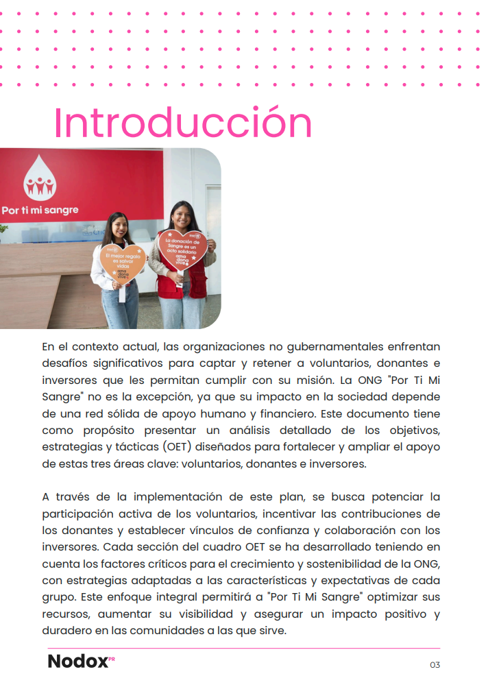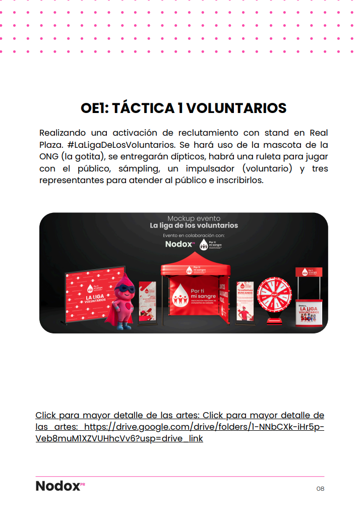 Nuestro plan incluye tácticas innovadoras que maximizan el impacto y alcance de las estrategias. Entre las principales acciones se destacan las alianzas con influencers, quienes potencian el mensaje de la marca y generan confianza entre sus seguidores. Asimismo, desarrollamos eventos en centros comerciales y activaciones experienciales que permiten conectar de manera directa y emocional con el público objetivo. En el ámbito digital, diseñamos campañas de publicaciones en redes sociales enfocadas en el reclutamiento de voluntarios y la promoción de la donación, asegurando una comunicación constante y atractiva.